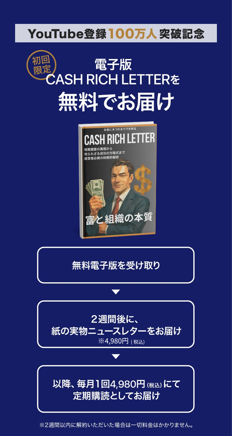 CASH RICH LETTERは、中小企業経営者向けに、経済環境の変化に対応するための実践的なアドバイスを提供する定期刊行物です。脱・税理士菅原による重要なトピックスを取り上げ、わかりやすく解説しています。