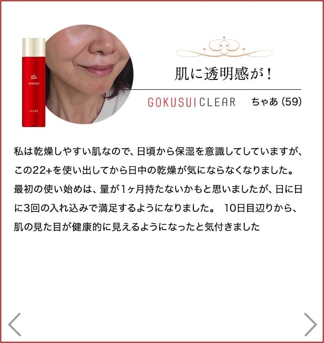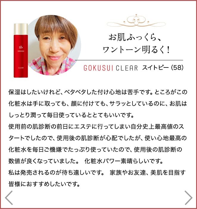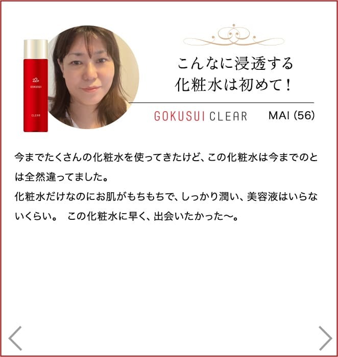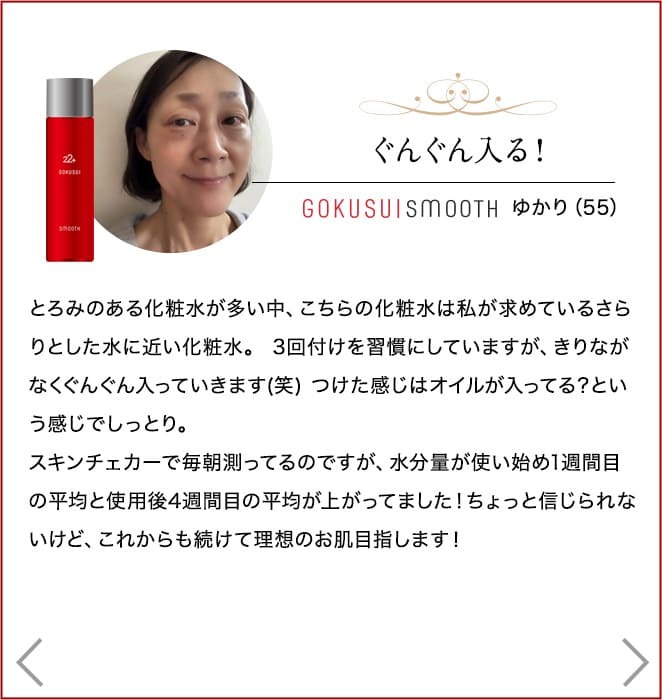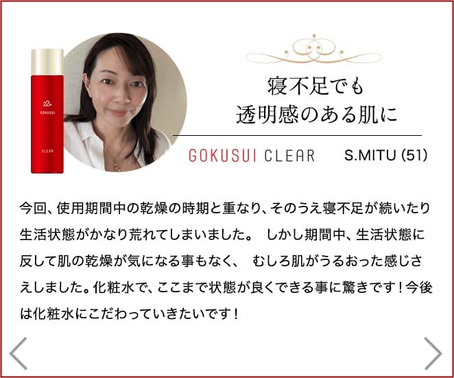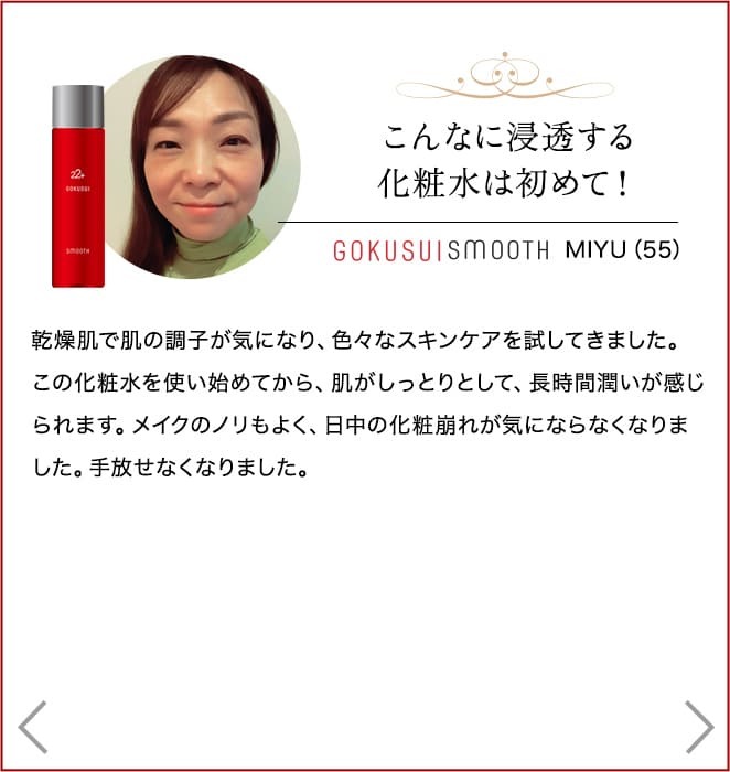 お肌の状態やお悩みに応じて調整していただければ、他社の商品と併用していただいても問題ございませんが、より変化を感じていただくためにもできるだけGOKUSUIのご使用をおすすめいたします。